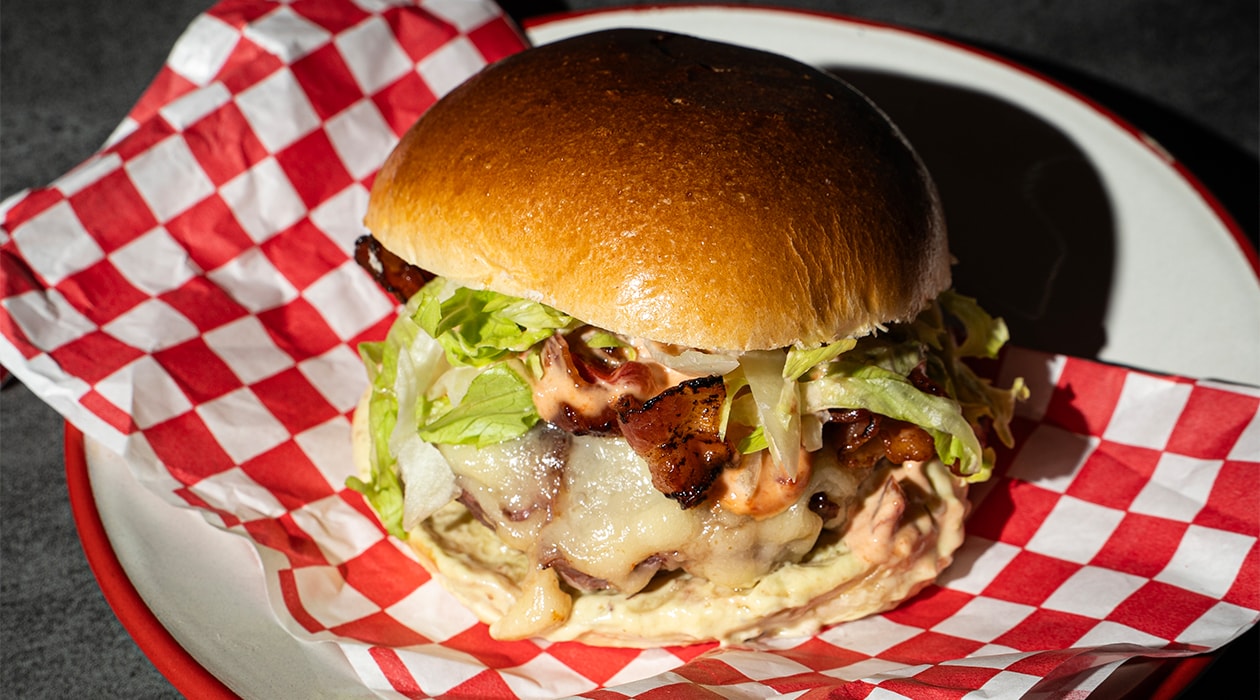 Burger mediterránea con salsa de queso, pesto rojo y Hellmann’s Suave y Ligera