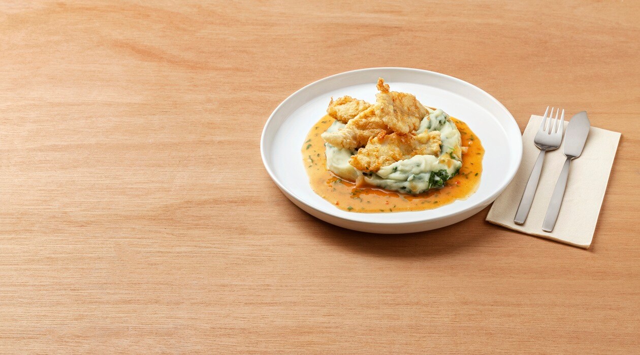 Filetes de pescado con puré de espinacas y salsa de marisco