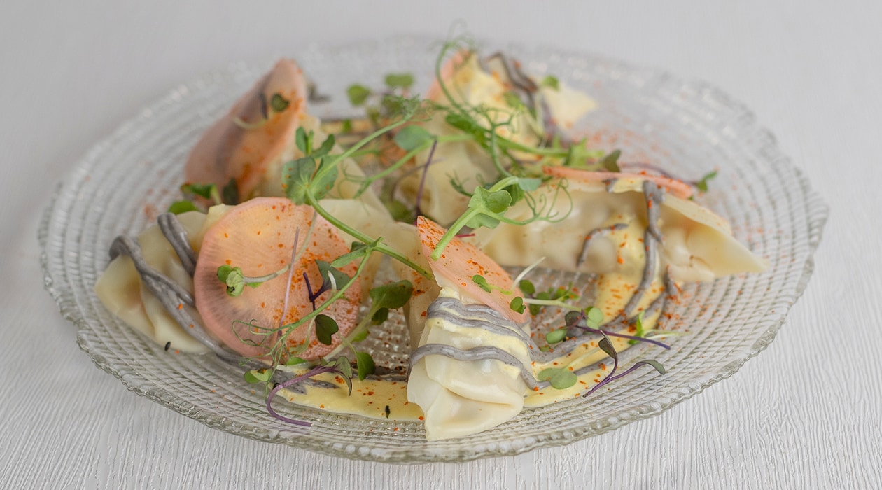 Gyozas de carrillera, tinta y maíz