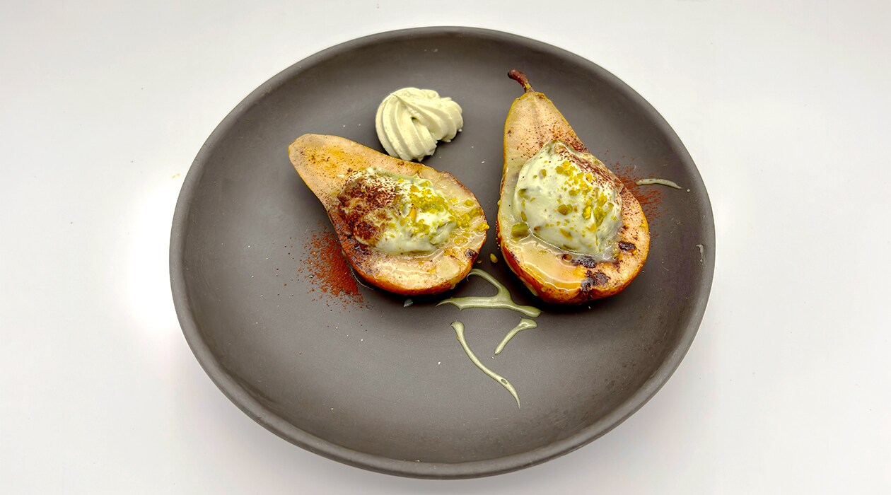 Peras caramelizadas con relleno de queso y pistacho